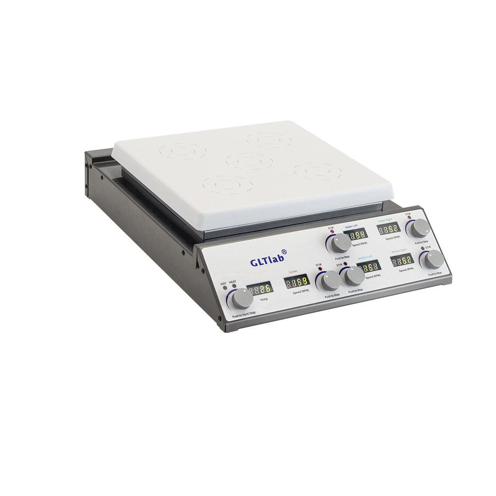 2    The five magnetic stirring positions can be used individually or in combination, each with a different speed setting and a digital display.